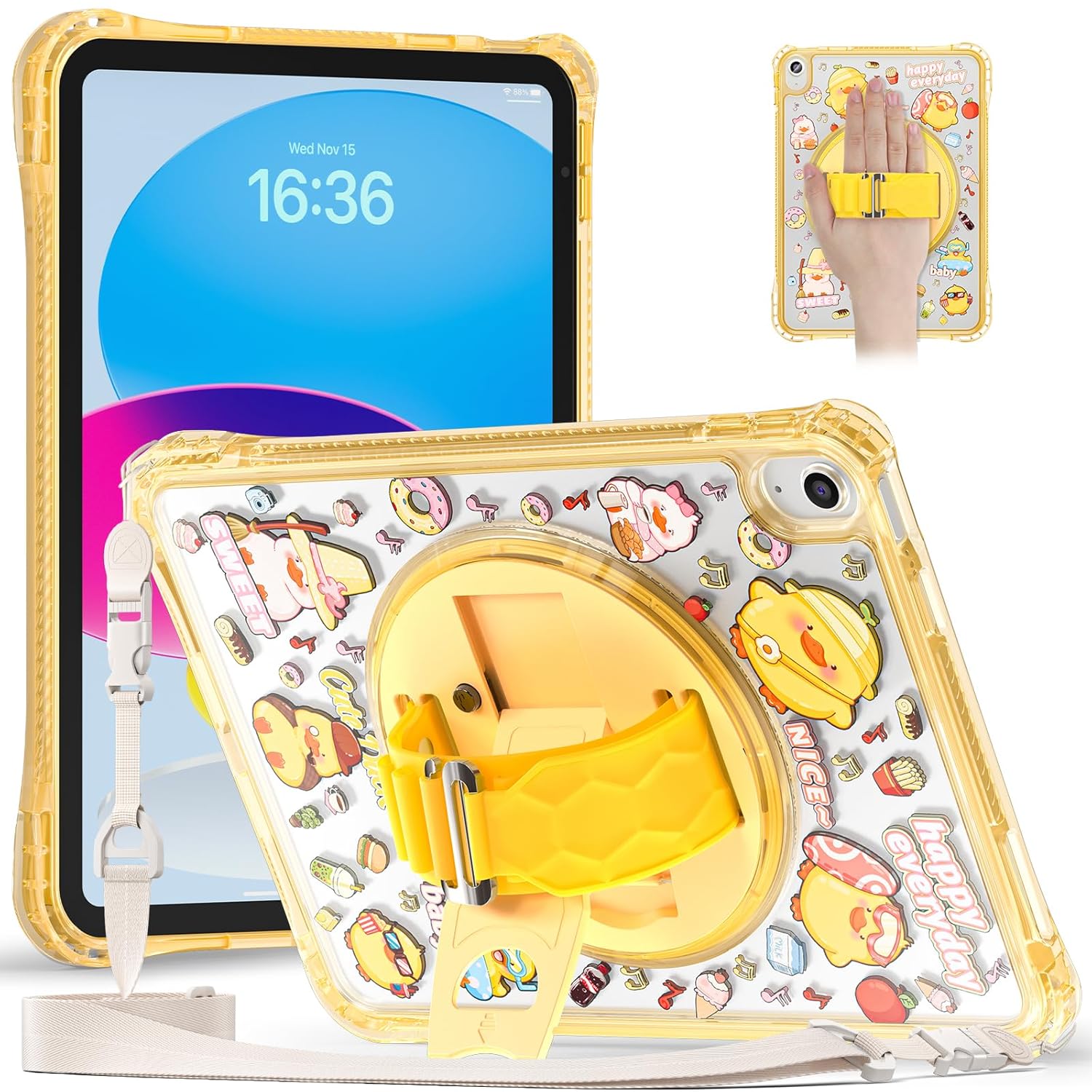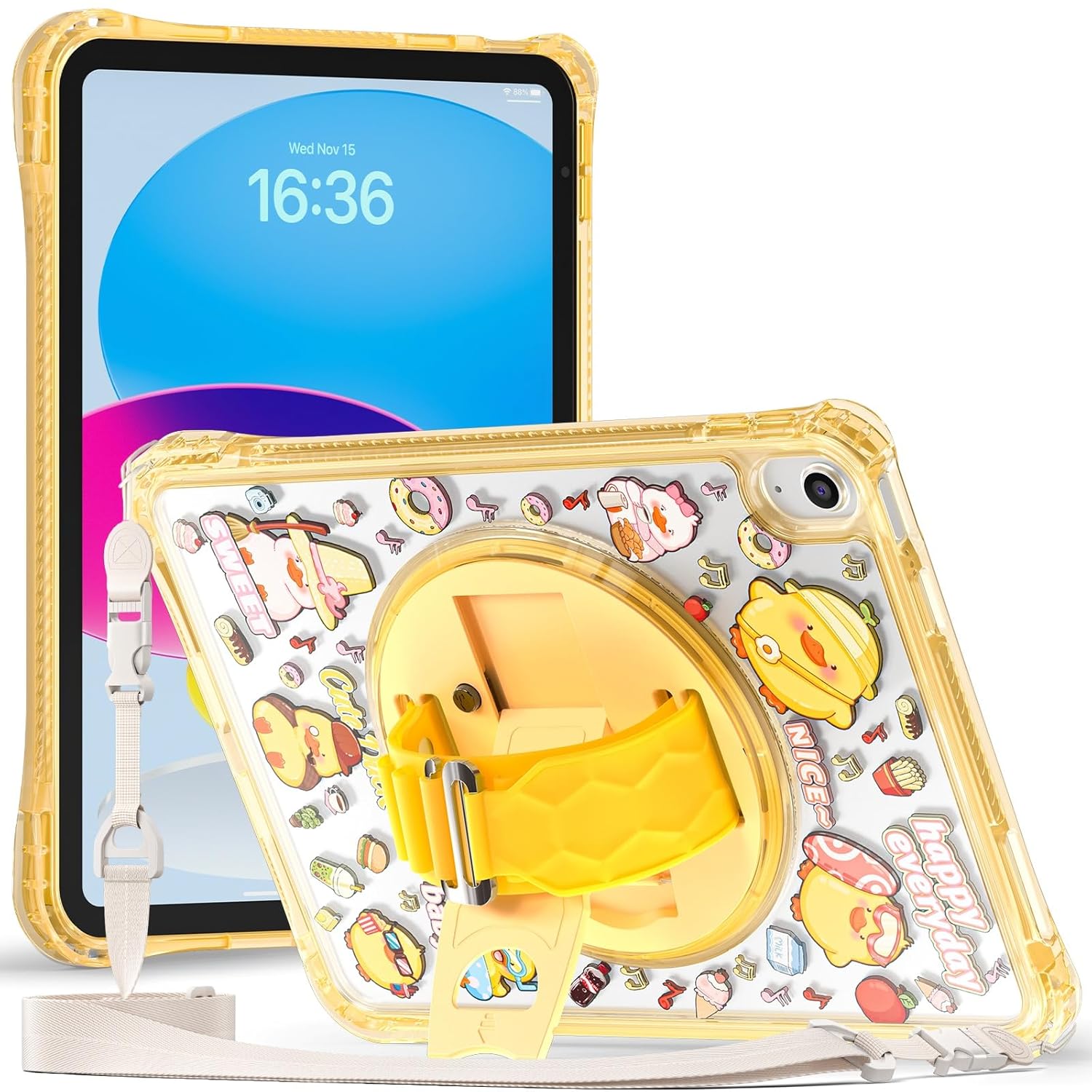 Case Cover for Apple iPad (A16) 11th/10th Gen 2025/2022, Rugged Transparent Back Case for iPad 11th/10th Gen 2025/2022 with Hand Grip 360 Roatating Kickstand and Shouder Strap, Transparent Duck