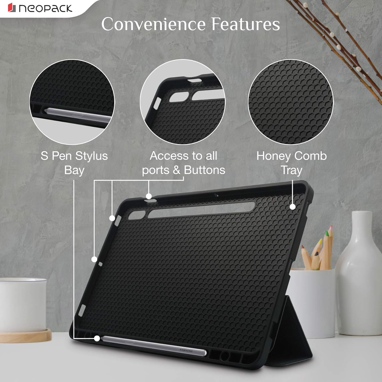 Neopack Delta Trifold Smart Cover/Flip Case with Tempered Glass for Tablets Samsung Galaxy Tab S7 (Black)