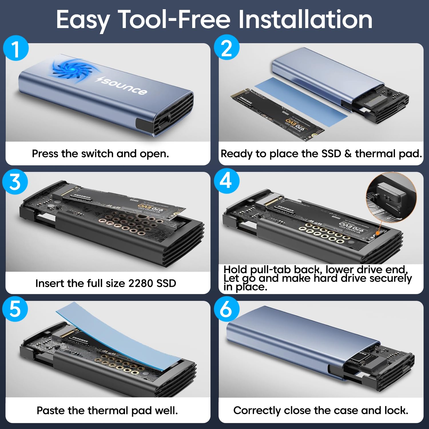 NVMe M.2 Enclosure with Fan – Sounce India NVMe SSD Enclosure, USB 3.2 10Gbps, Tool-Free PCIe NVMe Reader, USB-C, Supports M & B&M Key 2230/2242/2260/2280 SSDs (RTL9210)